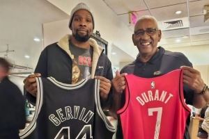 致敬前辈!杜兰特和马刺名宿“冰人”乔治-格文交换球衣