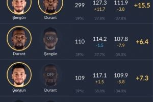 - KD和申京同场时火箭净效率+15.5 KD和申京都不在场时-58